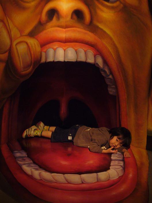 そう、今日の朝熱が出ました とうとう出ちゃったか・・・と インフルエンザが怖いので病院に連れていきたいけど・・・ なんかねぇ・・・ということで ばあばに連れて行ってもらいました 以外と、予約をしていくので病人でごった返してる感じではなかったらしいです 昔のようにごったがえした状態ってわけじゃないんですねぇ それも携帯で予約が出来るそうで 今何番目ですと書いてあって、自分の番の近くまで車の中で待ってるという 事も出来るみたいですね すごいもんだ そして、一応インフルエンザの検査をして、普通の風邪だったみたい 熱は2、3日は続くとは言ってましたが 安心しました そして・・・・熱が高いくせによく食べる息子 ゼリーにヨーグルト たまごぞうすいにうどん パンも食べたな・・・ 食べすぎだってば そんな高い熱でよく食うな・・・あたしだったら食べれないよ(笑) 最近・・・というか昨日 お前は天使じゃなくって悪魔だよ(笑) 寝顔は天使なんだけどなぁ・・・・・ ママの風邪もすっかり治り、元気になりましたー え?この写真はなんだって? トリックアートって知ってますか? そう、絵が立体に見えたり、隠し絵やだまし絵になってて それが大きくて、人間を使った遊びとかできるんですよ たとえば 花が食われるー なんて写真も撮れちゃいます これ、宇宙科学博物館でイベントとしてやっていたものです だから、今はやってないかもしれません そういえば、東京タワーとかでもやってるとか 同じものかどうかは・・・・ 子供だまし~って思うけど、結構喜んで写真撮っちゃいましたよ ぜひぜひ騙されたと思ってやってみてくださいませ