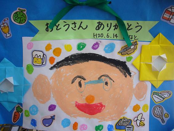 パパの歌を歌って プレゼントを渡して パパとふれあい体操や運動しました 花はすごいはりきっていました そして、今年のプレゼントですが こちら~ 去年の絵と比べると、かなりうまくなってます(当たり前か それも、去年と違うところがあります 大きく変わってます それだけ、パパの顔の認識が強いって事でしょうか? そう、眼鏡を描いてるんですっ 前のパパの日のプレゼントの絵は眼鏡がなかったのです すごい成長ですよねっ それも、結構眼鏡が上手に描けてるのにびっくり そして、この絵の周りには パパの好きだろうと思うもののシールが貼ってるとの事 まずは、ビール これは外せない(笑) ふふふ そして、さんま 後は、なすびとかそばとか貼ってるし 花はすごいっ パパの好みがわかってらっしゃる(笑) |
